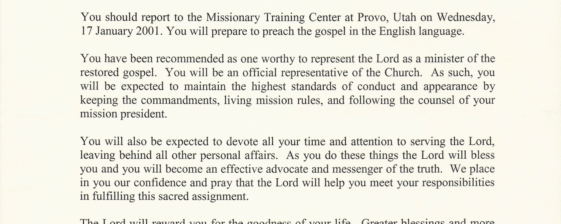 You should report to the Missionary Training Center at Provo, Utah on Wednesday, 17 January 2001.2 You will prepare to preach the gospel in the English language.