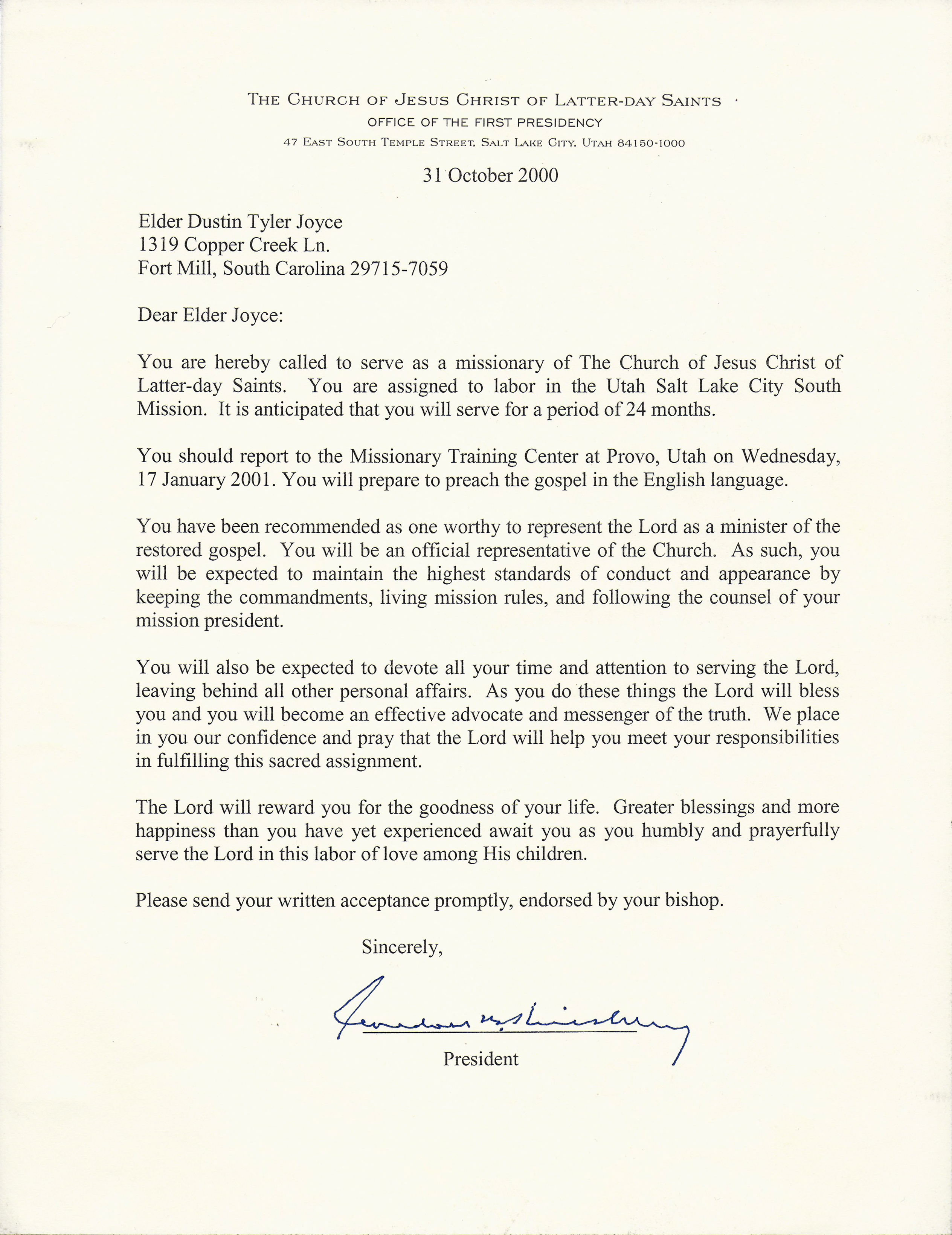 The letter Dustin received calling him to serve as a full-time missionary of The Church of Jesus Christ of Latter-day Saints in the Utah Salt Lake City South Mission. The letter is dated 31 October 2000 and is signed by then–church president Gordon B. Hinckley (1910–2008).