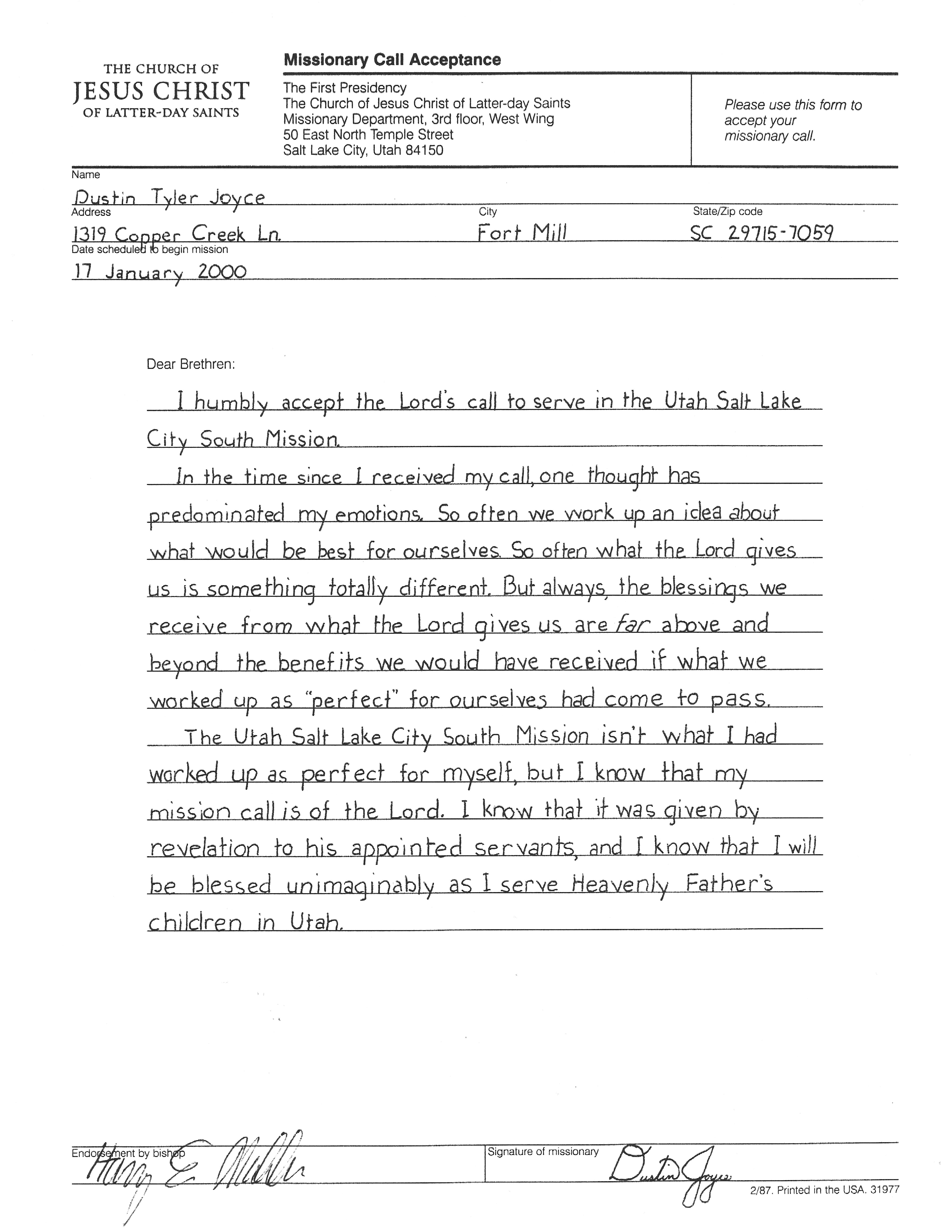 Those who receive calls to serve as full-time missionaries of The Church of Jesus Christ of Latter-day Saints are asked to “send [their] written acceptance promptly, endorsed by [their] bishop.” A form is enclosed with the mission call that provides space for them to do so. This is Dustin’s completed Missionary Call Acceptance form, signed by his bishop. Harry E. Mahler of the Pineville Ward, Charlotte North Carolina South Stake.