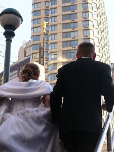 Susan and Dustin climb the steps out of the 66 St-Lincoln Center subway station on their wedding day, 29 February 2008. Note the statue of the Angel Moroni on the spire of the Manhattan New York Temple of The Church of Jesus Christ of Latter-day Saints.