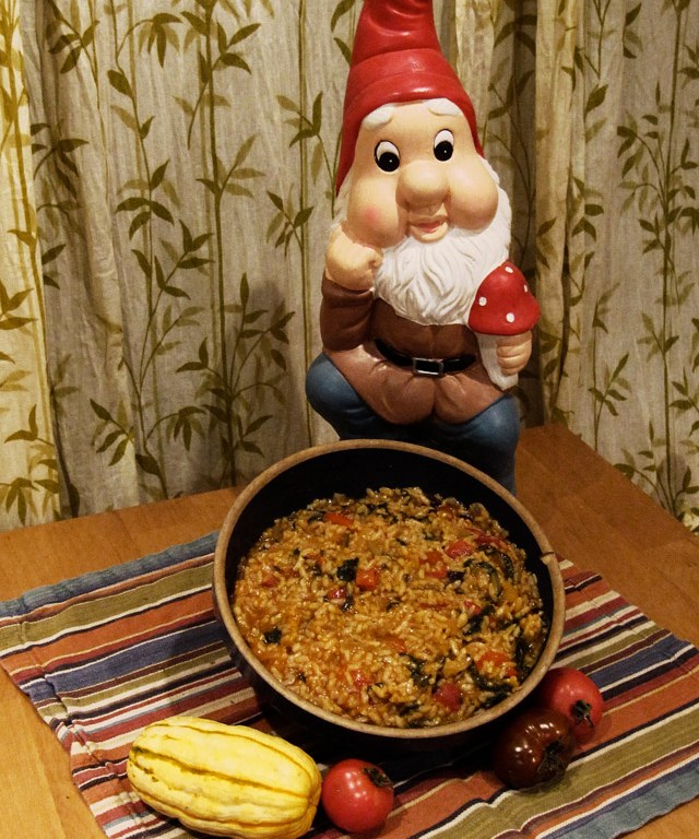 Heat the olive oil in a heavy large saucepan over medium-high heat. Add the bell pepper and onion and sauté until the onion is golden, about 8 minutes. Add the garlic and sauté 5 minutes. Reduce heat to low. Add rice and stir to coat with oil. Add stock, greens, and tomatoes and bring to a boil, stirring frequently. Add saffron water, paprika, and salt. Reduce heat to medium-low. Cover and cook for 15 minutes. Mix in peas, cover, and continue cooking mixture until liquid is absorbed and rice is tender, about 5 minutes. Remove saucepan from heat and let stand 5 minutes before serving.