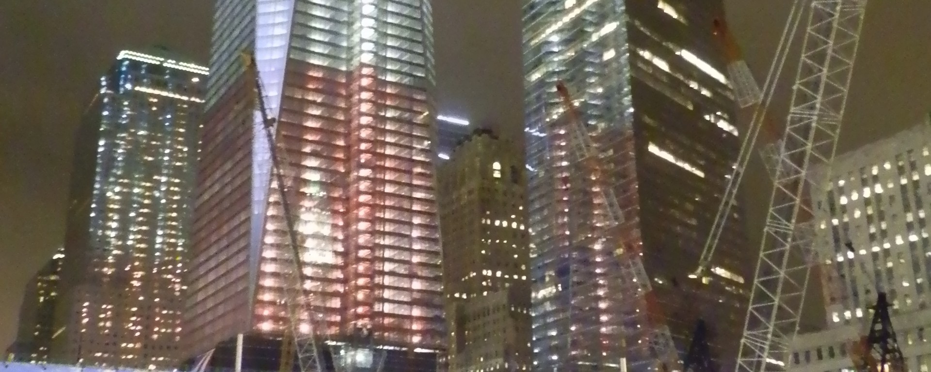 The new 1 World Trade Center, under construction, aglow in red, white, and blue. From the corner of Church and Dey streets.
