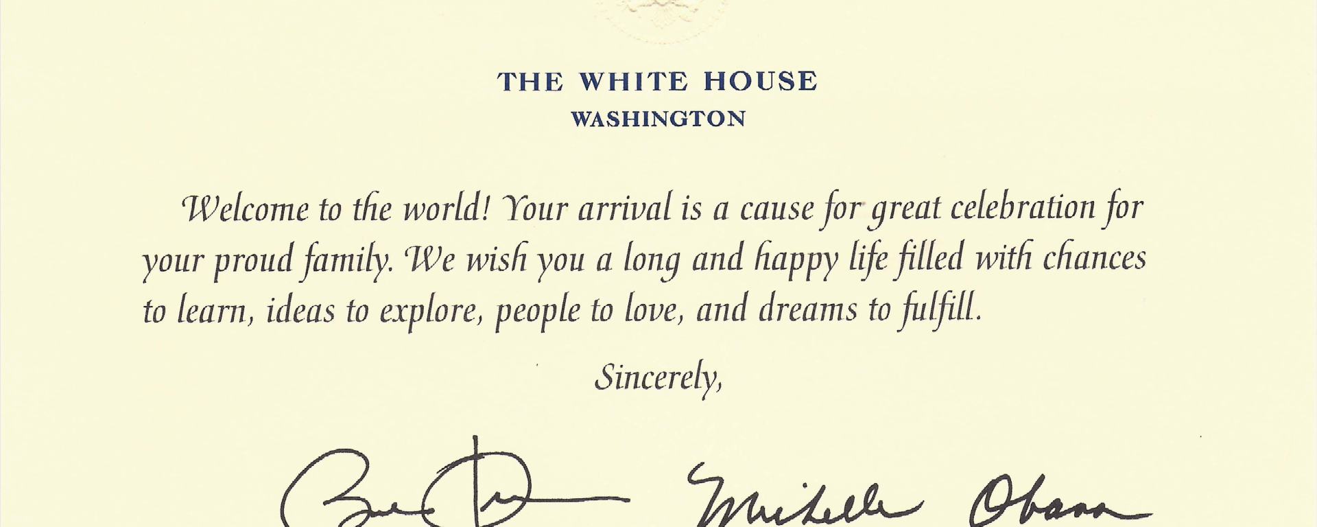 A few months after Fiona was born, we received an envelope in the mail addressed to her. The return address was just down 16th Street from where we lived in Washington, D.C. But it was a very famous address: 1600 Pennsylvania Avenue NW—the White House. Inside was a this card from the president and his wife welcoming our special delivery to the world. —Dustin