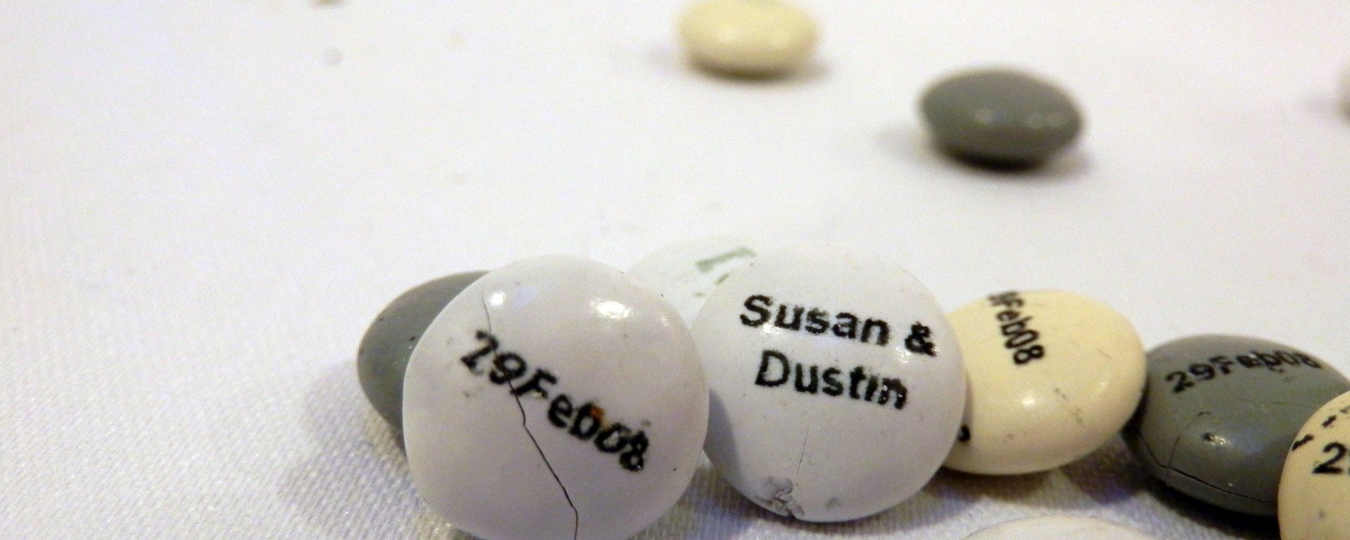 Do six-and-a-half-year-old M&M’s sound appetizing to you? Well, if you’re a four-year-old they do! When Susan and Dustin got married, we ordered customized M&M’s, with our names and wedding date printed on them. We had kept a few around in our cabinet, untouched—until yesterday, when we decided it was time for them to go. So after a few photos for posterity, Fiona popped them into her mouth.
