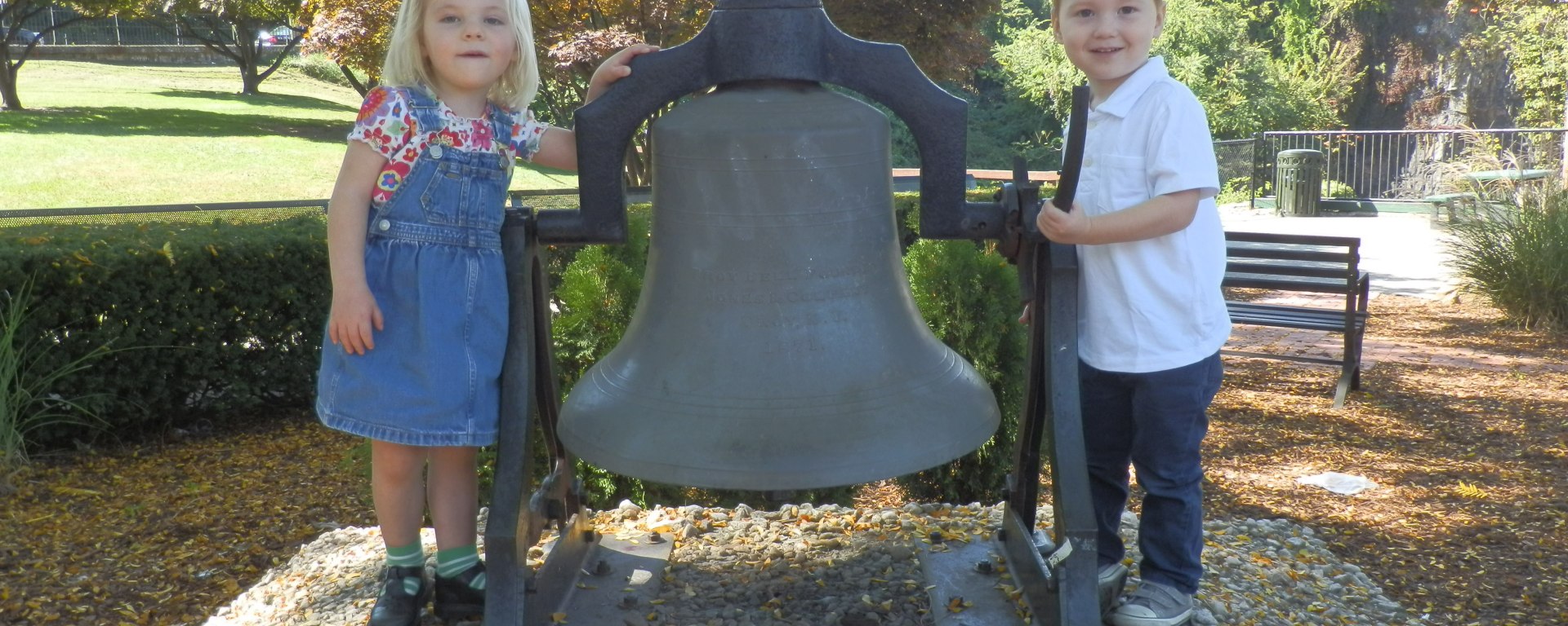 On 30 September 2013, Dustin and Fiona went to Paterson, New Jersey, with one of Fiona’s friends, Graham, and his dad, Erik. The goal was to see a waterfall, the Great Falls of the Passaic, as part of our homeschool preschool unit on water. On our way to the falls through Paterson Great Falls National Historical Park, we ran across a bell that Fiona and Graham found far more fascinating than any water tumbling over a cliff.