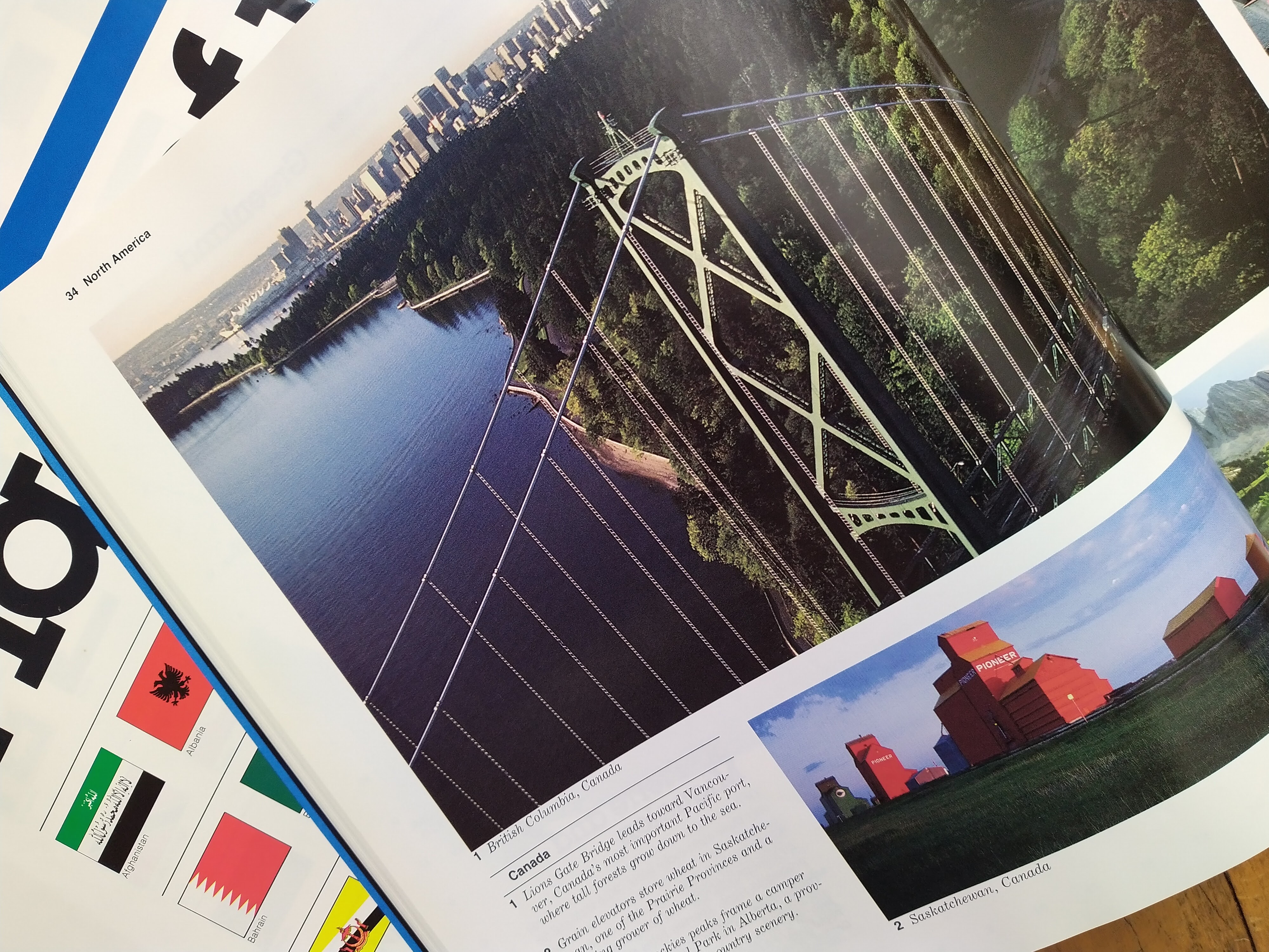 In this atlas, there is a photo of the Lions Gate Bridge in Vancouver, British Columbia, Canada, with Stanley Park and central Vancouver stretching beyond. I thought it looked like such a cool place. I said to myself, “I’m going to go across that bridge someday.”