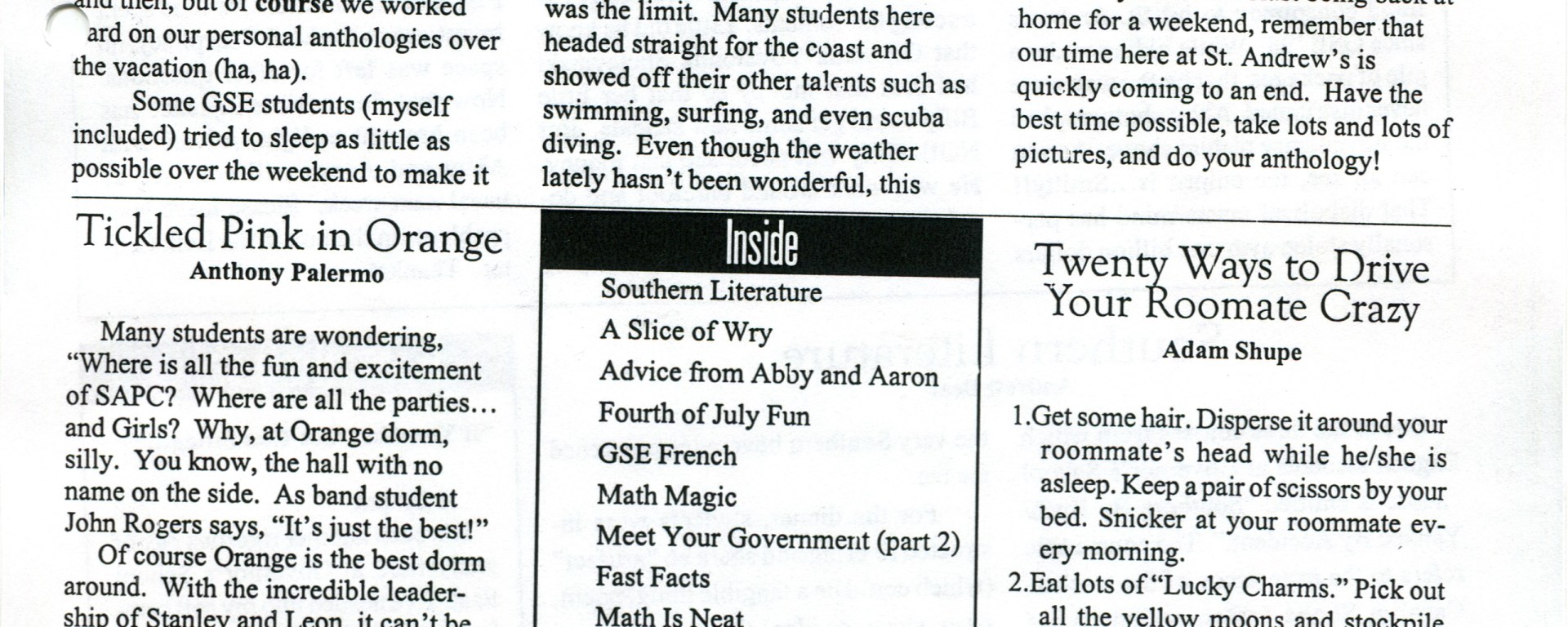 The 17 July 1999 issue of the student newspaper at the east campus of the Governor’s School of North Carolina, held on the campus of St. Andrews Presbyterian College in Laurinburg, North Carolina, 20 June–31 July 1999.
