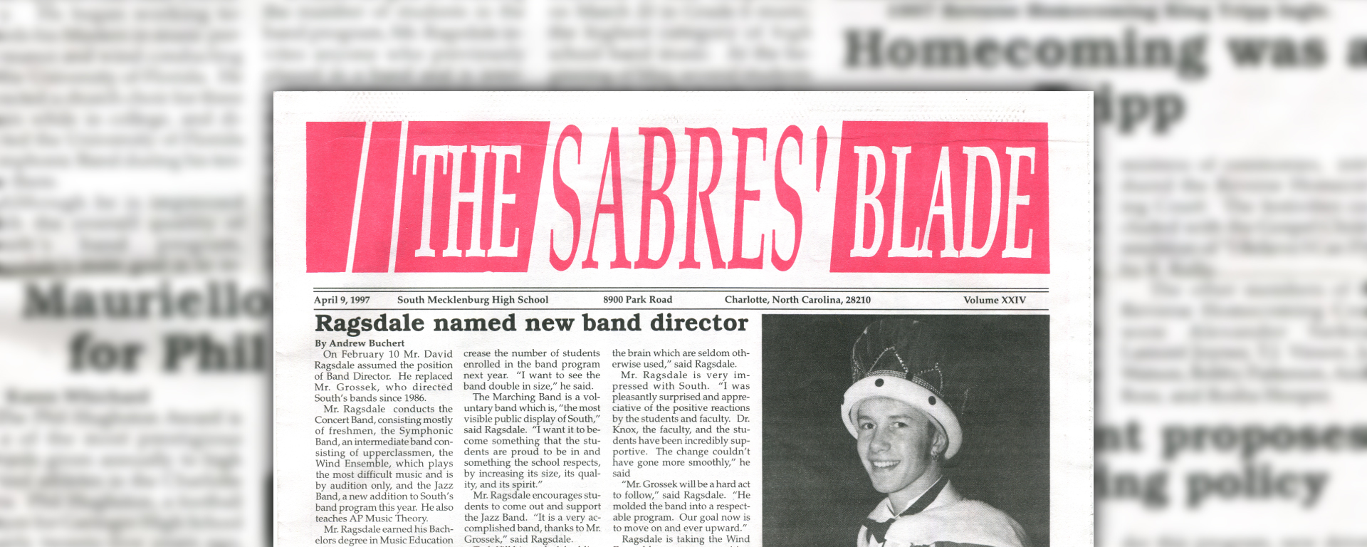 The 9 April 1997 issue of The Sabres’ Blade, the student newspaper at South Mecklenburg High School, Charlotte, North Carolina, USA.