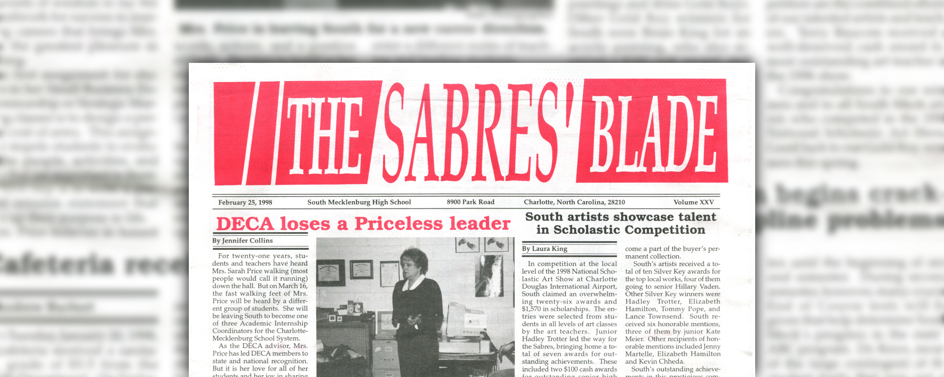 The 25 February 1998 issue of The Sabres’ Blade, the student newspaper at South Mecklenburg High School, Charlotte, North Carolina, USA.