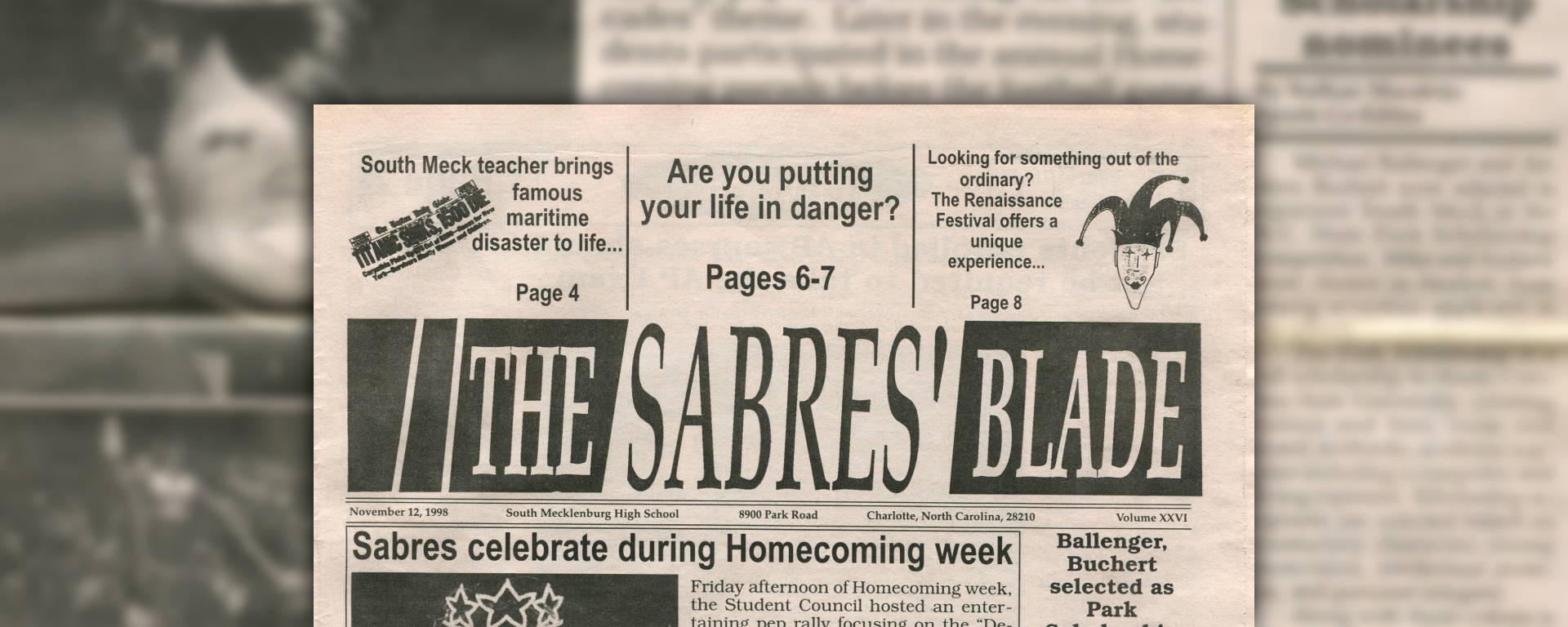 The 12 November 1998 issue of The Sabres’ Blade, the student newspaper at South Mecklenburg High School, Charlotte, North Carolina, USA.